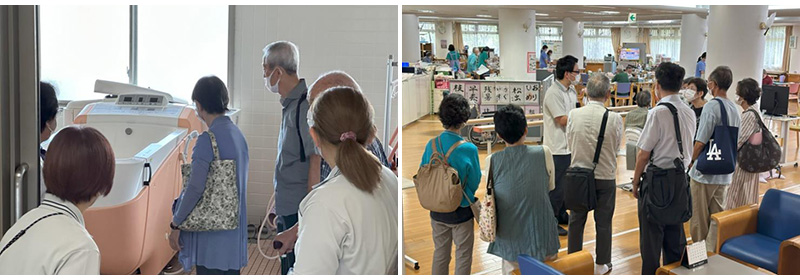 高齢者施設の種類と特徴、探し方・選び方などを学んだ後、会場の老健施設の入所フロアと通所フロアを見学しました。入所フロアではお部屋やお風呂、通所フロアでは設備や活動の様子などを見学しました。リハビリの内容やデイサービスとの違いなど、多くの質問がありました。