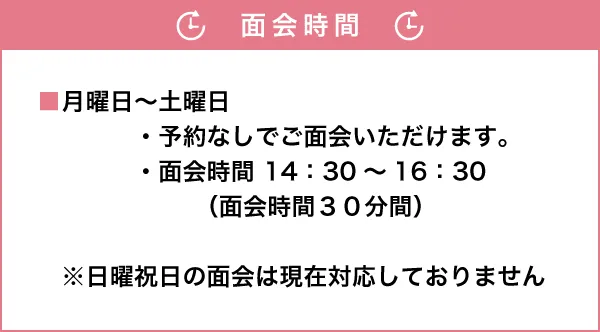 患者様の安静を保ち、充分な療養をして頂くためにご面会時間を決めさせて頂いております。