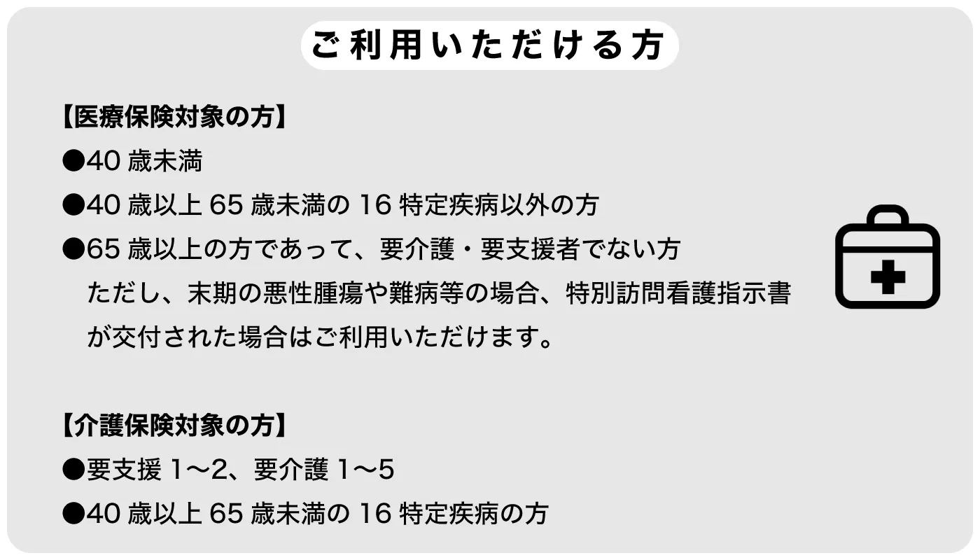 看護師がご自宅を訪問し、医療的ケアを提供します。